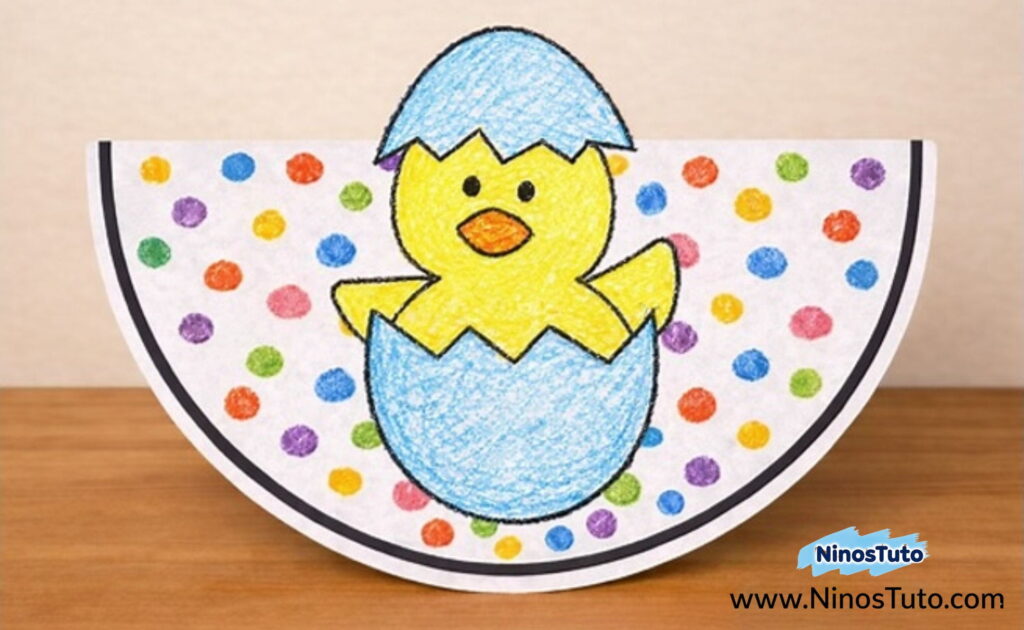 5. Pega la figura de tu pollito en el centro de la parte frontal del semicírculo.